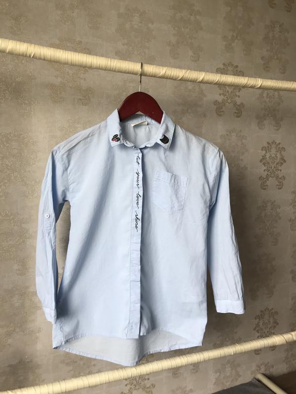 Розмір 134-140 см, 9-10 років Довжина 60 см, ПОГ 41 см, рукав 42 см Стан дуже хороший, бо є пляма (показала на фото) Рукав можна підкотити та зачепити на пуговичку На спинці подовжена