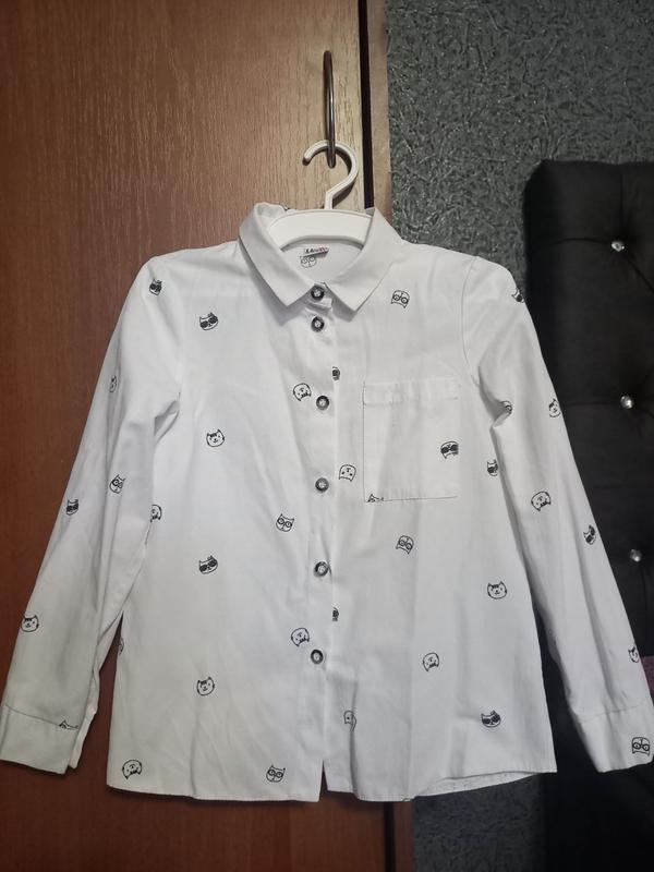 Стильна сорочка для дівчинки молодшого шкільного віку. Моделька прямого крою, красиво виглядає як зі спідницею, так і брючками. Зверніть увагу на цікаві деталі сорочки: принт з мордочками котиків, ніжний комірець, велика накладна кишеня на грудях. Матеріал – бавовняна сорочкова тканина, дуже приємна до тіла. Склад: 90% бавовна, 10% поліестер.