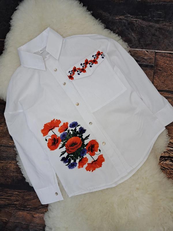 👉ОТШИВ ПОД ЗАМЛЕНИЯ КЛИЕНТА 1-3 РАБОЧИХ ДНЯ 🌺Стильная рубашка с имитацией вышивки 💓р.134-140- длина 68см/ рукав от горловины 68см/ обхват груди 100см- 💓р.146-152- длина 72см/ рукав от горловины 72см/ обхват груди 104см- 💓р.158-164- длина 74см/ рукав от горловины 74см/ обхват груди 108см 💓р.42-44(смотрите замеры)- длина 76см/ рукав от горловины 77см/обхват груди 116см Тканина: ХБ ПРИНТ двойной прорезиненный накат. Застегивается на пуговички. Карман рабочий. Цвет: белый с маками😍🤗 ⁇ модель немного удлинена 🚚Новая почта, есть наложка с предоплатой 🚛 Укрпочта- +5грн упаковка По оплате и доставке уточняйте дополнительно, к покупке! Возвращение отсутствует, делайте свой выбор обдуманно. Осмотрите товар в отделении,ссечение из дома не рассматриваются! Благодарю что дочитывали😊💙💛 ом