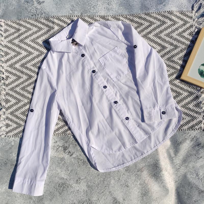 Класична рубашка із брошкою, гудзики темно-сині, якість 💥. На останньому фото є дефект від брошки, але його не помітно, якщо чимсь закрити. довжина від плеча по передній частині 52 см ПОГ 40 см рукав від шва 51 см дивіться інші оголошення, ще є спідниця, яка ідеально підходить до рубашки