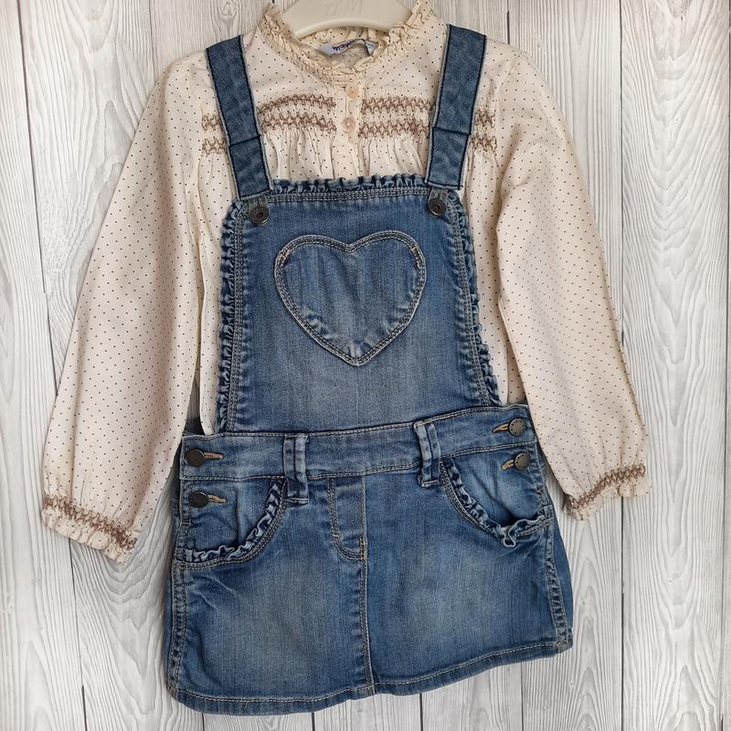 Фирменный джинсовый сарафан на девочку 100 см. Рубашечка вышитая фирмы Mayoral размер 104. На рукавчике одному чуточку виден значок. Вещи очень хорошего качества.