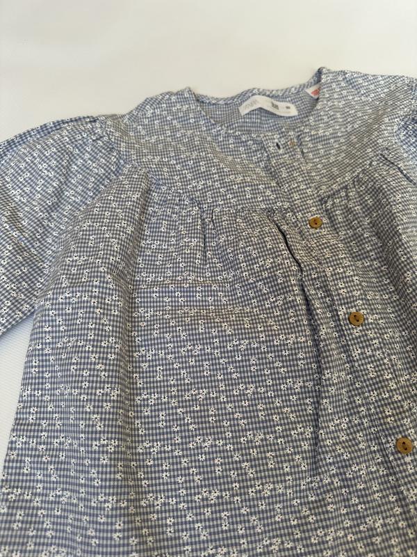 Дуже класна сорочка на дівчинку ZARA. Вільного крою та приємна на дотик. Принт дрібна ромашка. Рукавчик на резиночці. Розмір на 18-24 місяці. Довжина по спинці 36см