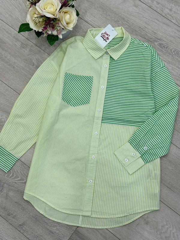 Сорочка від бренду Jennyfer Розмір xxs зріст 146-158 см(оверсайз) Яскрава двох кольорів сорочка на гудзиках має кишеньку на грудях Заміри Довжина 72 см Довжина рукава від горловини 63 см Плечі спущені Груди 50 см