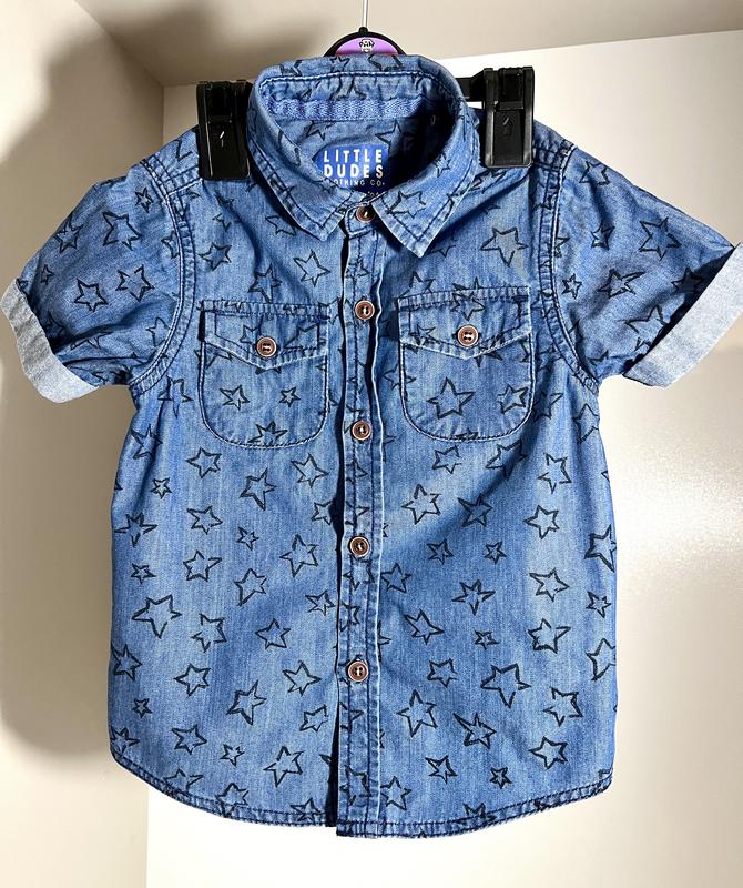 Синя рубашка в зірочку, стан нової, без дефектів, 86-92 см,на 1,5-2 роки Довжина 39см, ОГ- 32см.
