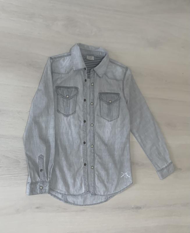 Джинсовая рубашка фирмы H&M. Производитель Бангладеш. 100% cotton, тончайший джинс, красивый дизайн с логотипом фирмы. Застегивается кнопками, красивый серый цвет. Состояние новой вещи.