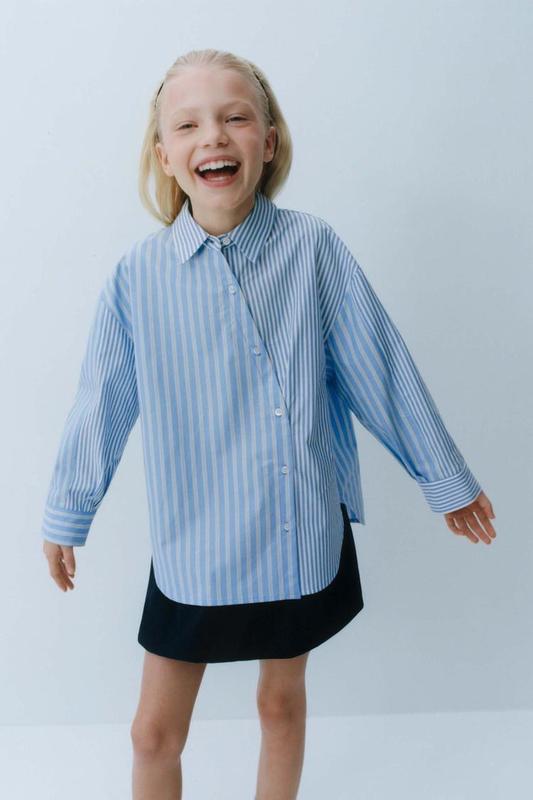 Сорочка з класичним коміром і довгими рукавами. Застібається асиметрично на ґудзики спереду. Блакитний