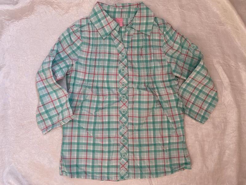 Сорочка Dopo dopo, р.110 (4-5y), салатового кольору в клітинку, рукав можна робити довгим або коротким, довжина 46 см, довжина рукава - 33 см, ПОГ 32 см. МІНІМАЛЬНА СУМА ЗАМОВЛЕННЯ ДЛЯ ВІДПРАВКИ - 100 ГРН. Так як політика сайту зараз - комісія за продаж 15% для товарів до 1000 грн, але не менше 15 грн. Розвантажую шафу, речі моїх дітей, якщо потрібні додаткові фото, пишіть.