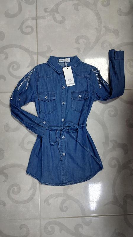 Джинсова сорочка плаття на дівчинку по бірці 6 років, по факту 4-5 років (110 ріст): довжина 60 см, ширина 35 см, рукав від плеча 45 см. Стара ціна 520 грн!