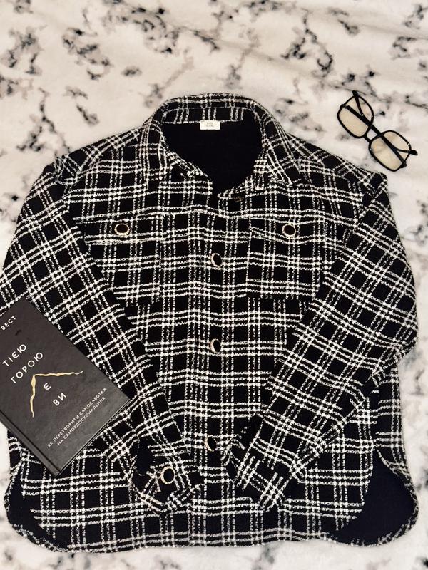 Твідова рубашка з цупкенької тканини Підійде як верхній одяг на теплу погоду або ж як один з шарів одягу Фурнітуру сфотографувала окремо, усі ґудзики в ідеальному стані Є 2 кишеньки на грудях Стан чудовий, одягалася кілька разів Бренд River Island Розмір вказаний 11-13 років але піде також на ХХS