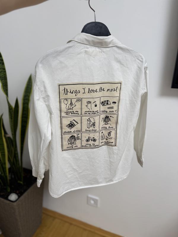 Сорочка на ґудзики принт малюнок тканий не наклеєний, що є перевагою в носінні бо малюнок не облазить можна носити і з 8 р по бірці вказано 10 але трішки маломірить