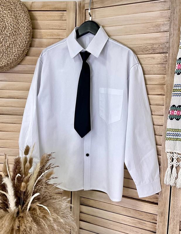 Сорочка з краваткою УНІСЕКС на ґудзиках декорована чорними швами тканина 100% котон виробник фабричний Китай СУПЕР ЯКІСТЬ! зріст/довжина/пог/рукав від плеча похибка+-2см 146/61/50/45-2шт 152/63/51/47-2шт 158/65/53/49-2шт 164/66/54/51-2шт 170/68/55/53-2шт