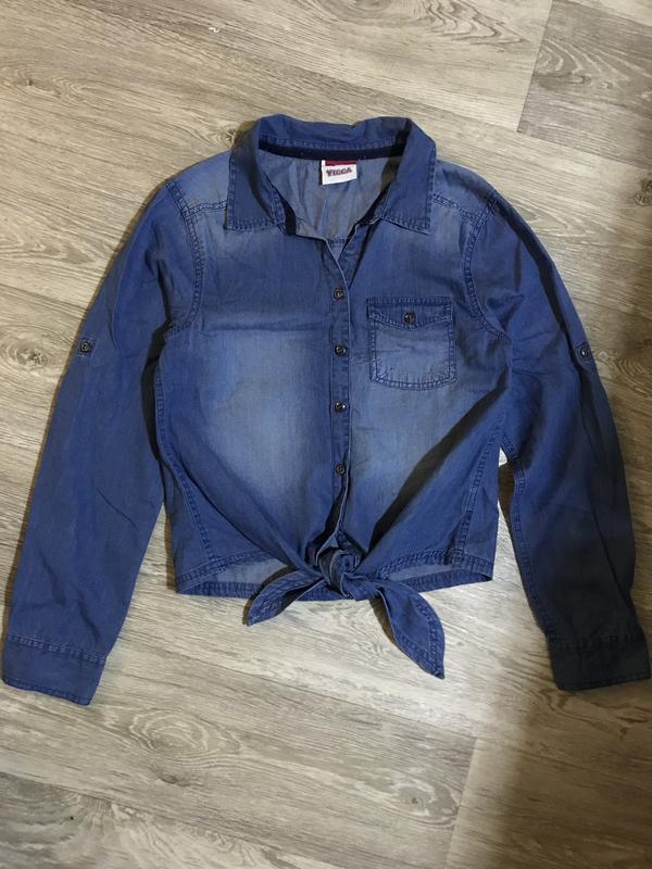 Джинсовая рубашка на пуговицах, внизу завязки, растовка 158-164см, так же подойдет для размера xs-s