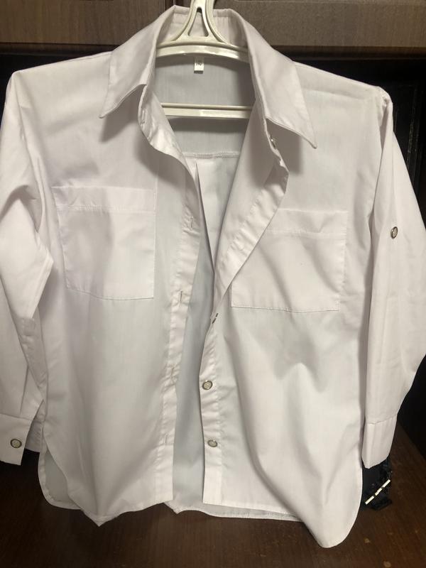 Біла сорочка, розмір 140. Класичний крій, довгий рукав, є ґудзики щоб зробити четвертний, дві кишені спереду. На ґудзиках. Стан відмінний, без плям та пошкоджень. Підійде для школи або святкових подій.