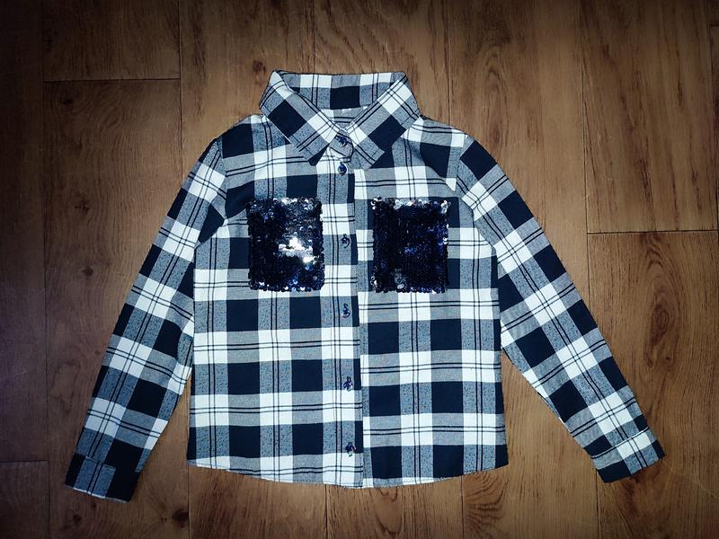 Сорочка в клітинку для дівчинки приблизно 122см. Стан хороший, на кожен день або для дому. Кишеньки виконані з паєток що перевертаються. Заміри: довжина 46см, рукав 45см, плечі 31см, напівоб'єм під руками 37см. Дивіться також інші мої оголошення)