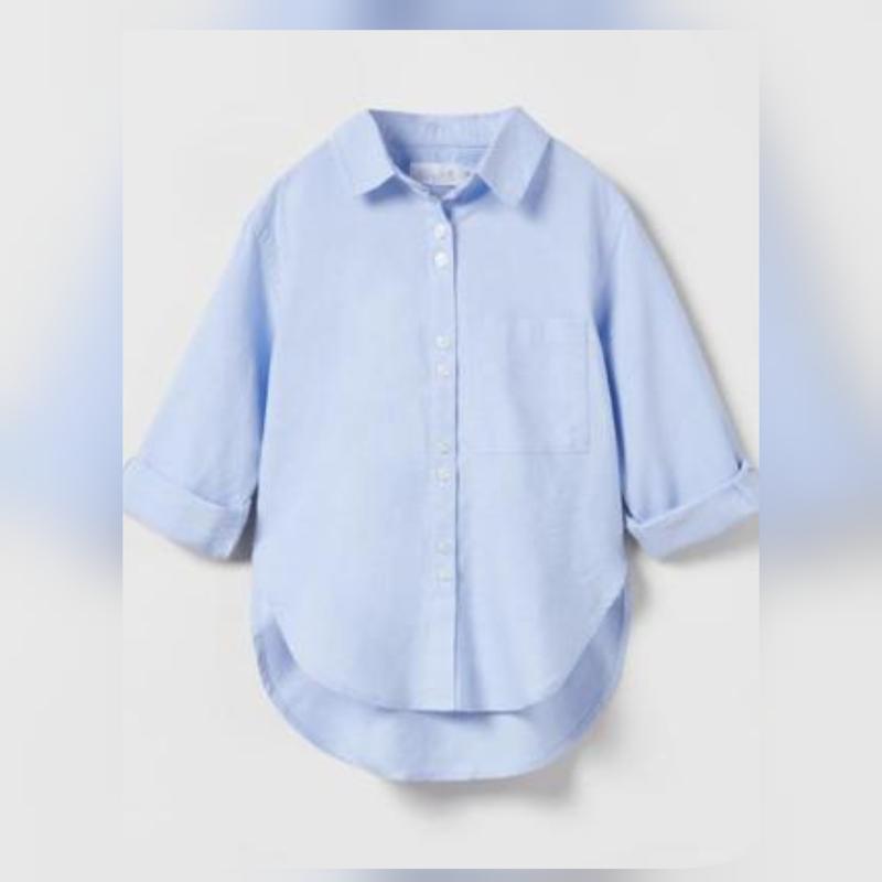 Котонова сорочка насиченого блакитного кольору з заокругленим низом від бренду Zara в наявності розмір 📌140 10 років пог 45 довжина ( перед/зад) 55/64 довжина рукава від коміра 59 Zara оригінал з бірками