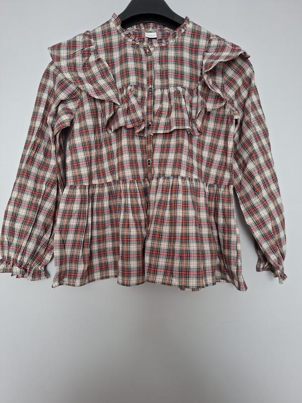Красива стильна бавовняна блузка з воланами для дівчинки рукави внизу на ґумці блузка застібається на ґудзики в плечах 35 см ПОГ (від пахв) 45 см рукави 51 см довжина 56 см стан нової