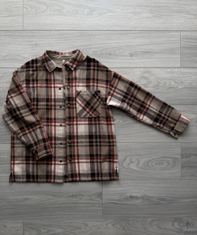 Трендова сорочка в клітинку, не тонка, з легким начосом. Трендові коричневі кольори. В складі акрил, бавовна, поліестер. Оверсайз. Розмір вказаний 146, але спокійно підійде на 152-158. Стан відмінний. Рукав від горловини 64,5 см, довжина 64 см