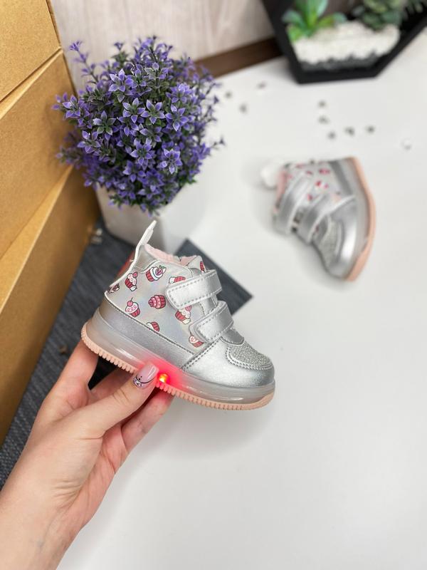 ⬆️⬆️⬆ 😍 Модні та стильні сріблясті черевики від Tom.m.😍Збоку замочок, спереду фіксація на дві липучки. Матеріал підкладки м'який фліс. Устілка шкіряна із супінатором. 610грн 22р. - 14,5см 23р. - 15,0см 23р. - 15,0см 24р. - 15,6см ❗ Вимірювання зроблено всередині по устілці особисто мною, похибка 1-2мм допустима. ❗ Підошва з підсвіткою. Гарантію на працездатність підсвітки не даємо.