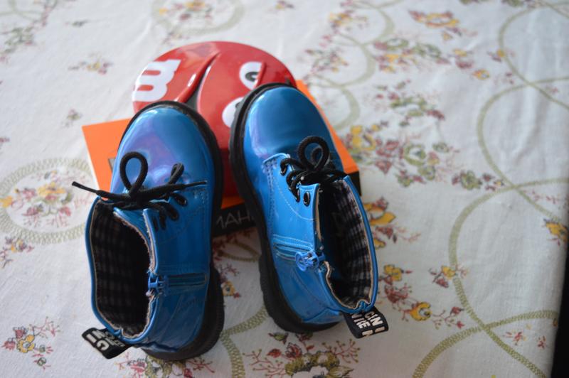 Ботиночки носились мало, очень быстро стали малы. Очень яркие голубые ботинки. Купили на Али Экспресс. Есть незначительные следы носки, видимых дефектов нет. Верх - синтетика под лак, Внутри - хлопчатобумажная ткань.