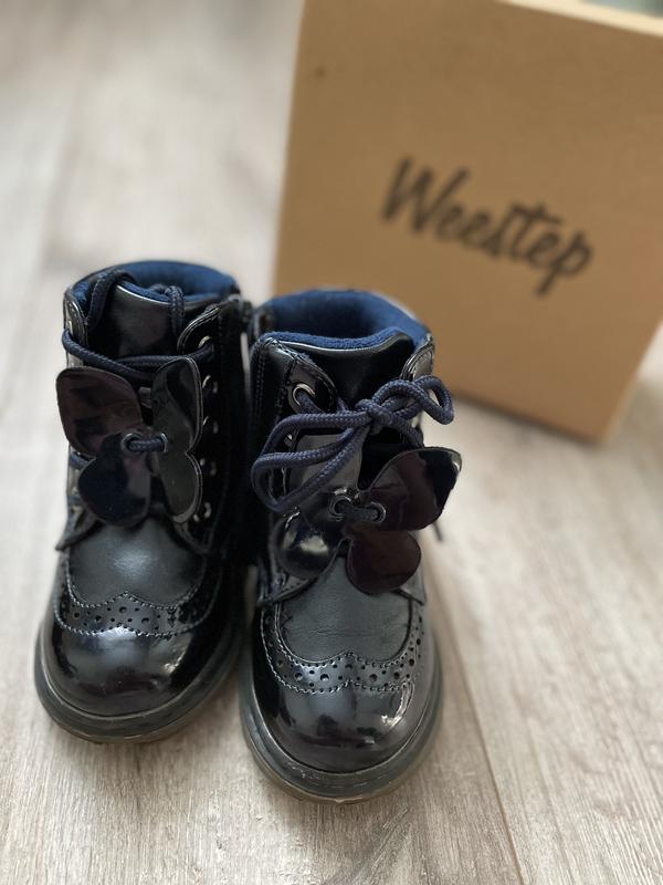 Стильні черевики від TM Weestep Стан нових. Верх - лакована екошкіра, в середині фліс, оздоба - метелик(знімається при бажанні), є шнурки і збоку замок.