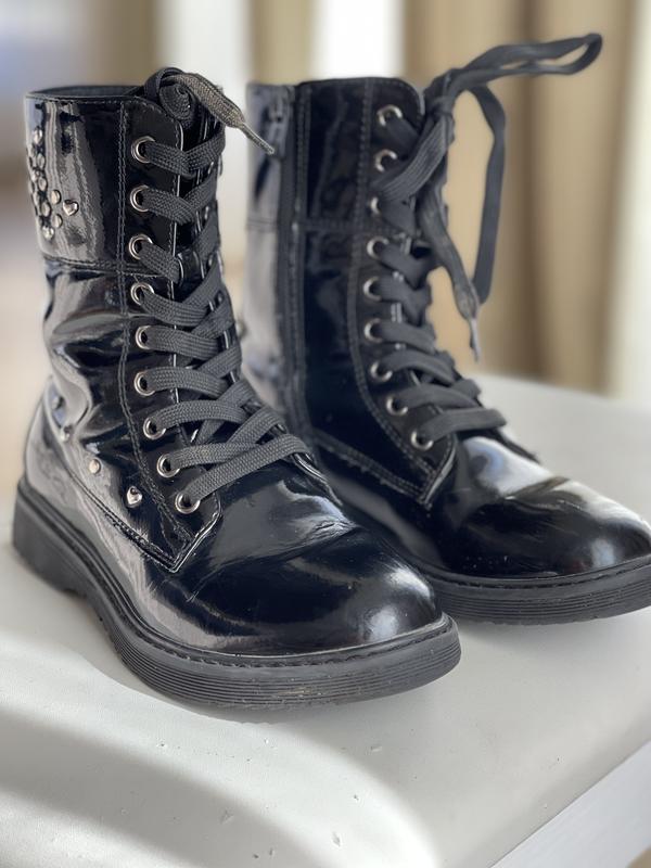 Лакові, шкіряні чобітки !!! Високі до ікри! Внутрі -цигейка( тепленькі, Но не зима)!шнурівка і замок! Трошки є вигин на замку із-за анатотомічної стопи донечки ! Незначні царапини, одна глибша на носку, але при носінні не потімітні взагалі ! Всі заклепки на місці….розмір устилки 20,5 см