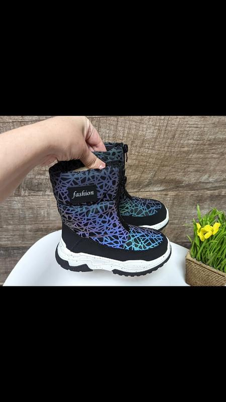 Верх водонепроникна і вітронепродуваєма плащівка ( світловідбиваюча). Чим більше на них потрапляє світло, тим більше вони змінюють колір з темного на яскравий . Всередині густе, тепле хутро (натуральна овчина 60%). Спереді на замочку. Легкі та зручні. Розміри: 27р-17,8см ЕС