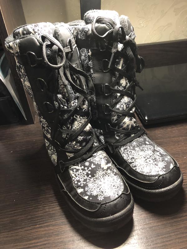 Термоботинки в ідеальному стані(видно по підошві), носили мало так як було декілька пар зимового взуття. Теплі, дихаючи устілка, не слизькі. Захист від снігу. Підійде на високий підйом, бо самі таким страждаємо.По устілці до 24 см(не витягується)