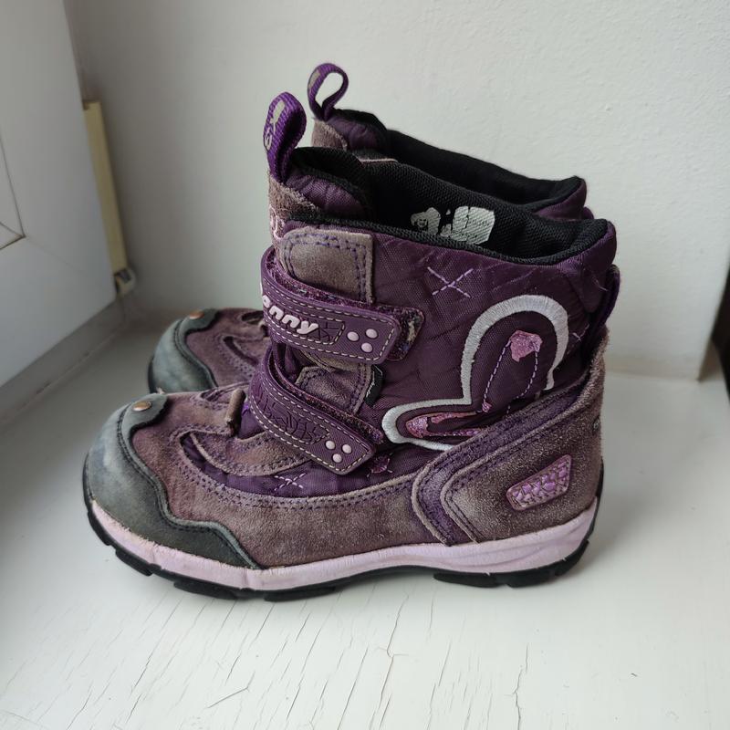 Зимові шкіряні черевики Ponny Sympa-Tex 29 розміру, устілка в середині 18.5 см від краю до краю, дивіться замір на фото. Матерал верху натуральна замша, текстиль. В середині утеплені натуральним хутром. Липучки липнуть нормально. Є потретості збоку на підошві, не такий яскравий колір бо після прання (внучну). Зверху є нюанс - надірваний текстиль, дивіться на останньому фото.