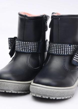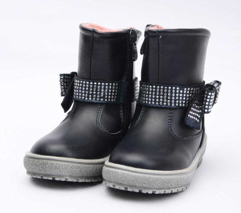 Черевики дитячі зимові дівчинка темно-сині Розмір дитячих взуття: 22; 23; 25 Вид взуття: Черевики Застібка: Замок Матеріал верху: Штучна шкіра Матеріал підкладки: Штучне хутро Стать: Для дівчаток Прошивка: Немає Супінатор: Ні