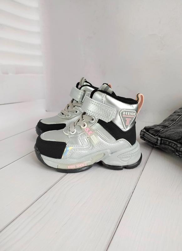 💎 🦋 Модні сріблясті хайтопи.💎 Усередині утеплені флісом. За допомогою липучки можна регулювати обхват ніжки. Збоку є блискавка. Резинка – імітація шнурка. Устілка шкіряна із супінатором 22р. - 13,8см 23р. - 14,4см 24р. - 14,8см