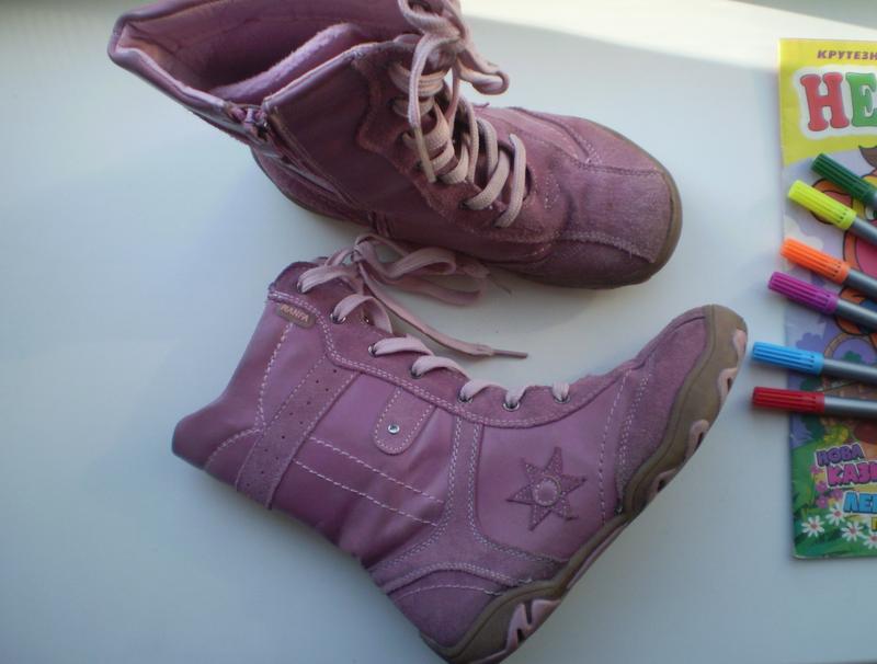 Черевики дівчинці 33р., рожеві, екошкіра, замша Верх комбінований з екошкіри і замші. Зручно застібаютсья на блискавку, і регулюються шнурками. Всередені утеплювач у вигляди флісу "травки". Устілки виймаються. Довжина устілки см Висота від п`ятки см Нюанс - невеличка зачіпка біля блискавки (останнє фото). Передоплата на карту Приватбанку. Пересилаю Укрпоштою, Новою Поштою. Повернення не передбачене.