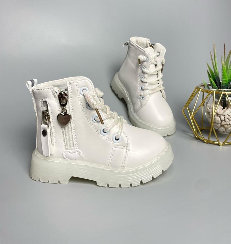 Білі черевички, які пасуватимуть вашим красуням під будь який верхній одяг😍 💗Верх якісна еко шкіра, всередині утеплені мікро флісом 💗Устілка також утеплена 💗Застібаються на блискавку та додатково шнуруються по підйому ніжки 💗Шнурівочка гарно переливається✨ 💗Легенькі, як хмаринки 💗Розміри: 21 - 13,9 см 22 - 14,3 см 23 - 14,8 см 24 - 15,2 см 25 - 15,7 см 💸Ціна:490 грн 🤍🤍🤍