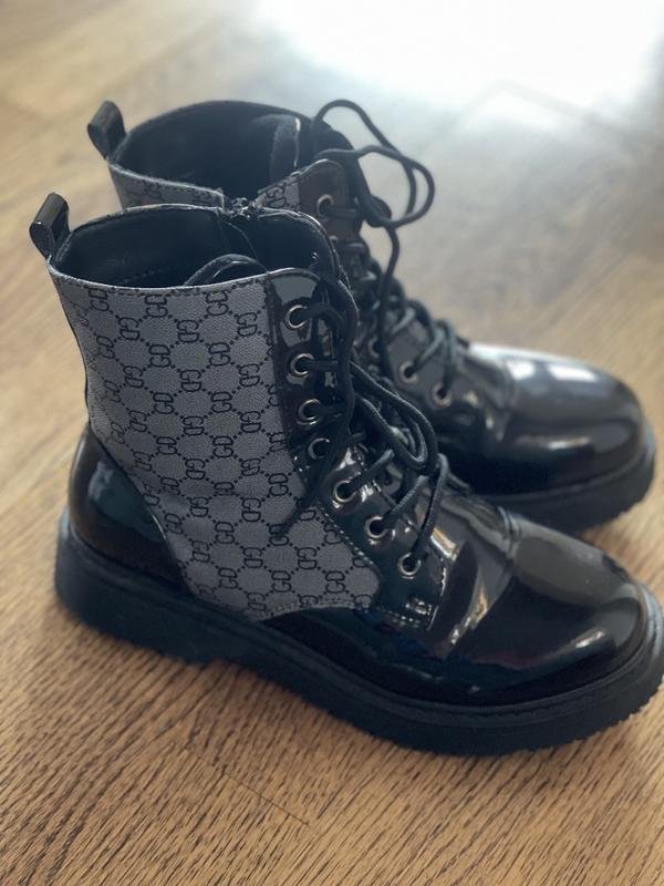 В наявності. Розмір 35. В хорошому стані, носили дуже мало, виросли. Лакована еко шкіра+ замінник канва, всередині на баєчці ( велюр). На сезон весна-осінь ідеальні. Шнурівка+замок