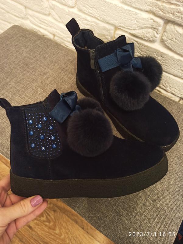 Нові черевики (з биркою) на дівчинку. Фірма Канарейка. 36 розмір. Устілка шкіра, виймається, довжина 21,8-22 см. Застібаються на блискавку. Темно-синього кольору. Матеріал — щось за типом замші. Збоку вставка-гумка з камінчиками та стразами. Спереду прикрашені красивими хутряними помпонами (не розв'язуються). Не важкі! Сезон весна-осінь. Дуже гарні та стильні, на ніжці мають класний вигляд!