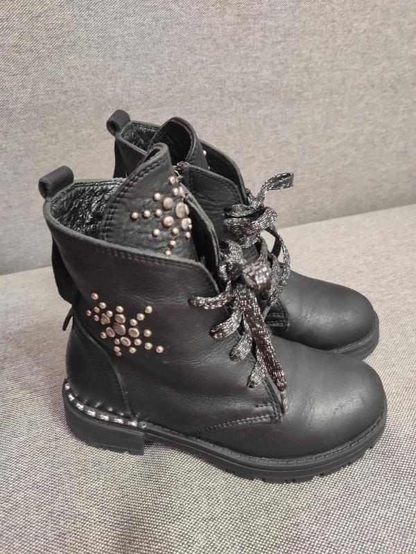 Шкіряні черевички, дуже класні. Всередині шкіра, тоненький утеплювач, устілка шкіряна ортопедична. Стан дуже гарний, але на одному черевичку донька зламала блискавку, погано застібається, краще її замінити. Розмір 28, устілка 17см