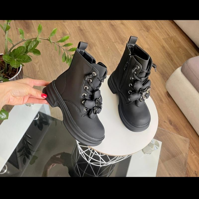 Верх якісна матова еко-шкіра Об’ємна підошва Всередині густе тепле хутро Бокова блискавка і шнурівка Декоровані прикрасою яку можна зняти 35 розмір 21.7 см 36 розмір 22.4 см 37 розмір 23 см (з сірою шнурівкою ) фото 3 ЕС