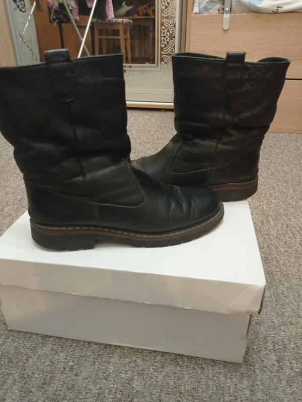 розмір 36, на стопу 23,5 максимум 24 шкіряні, теплі, прошиті, стан бу хороший, блискавки робочі підошва 1,5см каблук 2,5см, об'єм по голені 35см на широку ніжку не підійдуть
