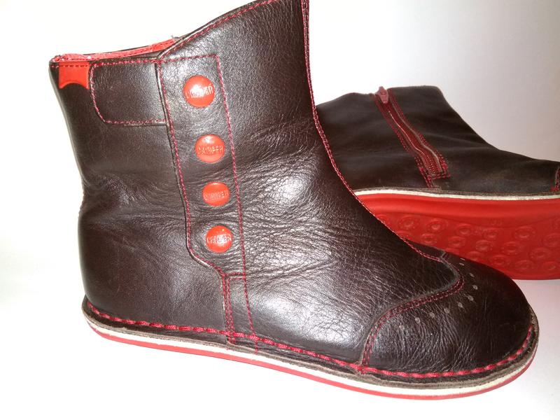 Шикарні демісезонні черевики Camper ( Іспанія) Натуральна м'яка шкіра Матеріал підкладки -верхній кант з натуральної шкіри,інша підкладка з синтетичного матеріалу, що дихає. Є тонкий шар наповнювача. Підійдуть і на широку стопу. Висота від підлоги 16 см. Розмір 33. Довжина устілки важко вимірювати, тому що не виймається. Але виходить близько 21 см рулеткою. З нюансів-на шкарпетках є подряпини, але вони не дуже помітні. І на деяких кнопочках є. Дуже зручні та м'які. В основному вони чудові!) Колір темно-коричневий.