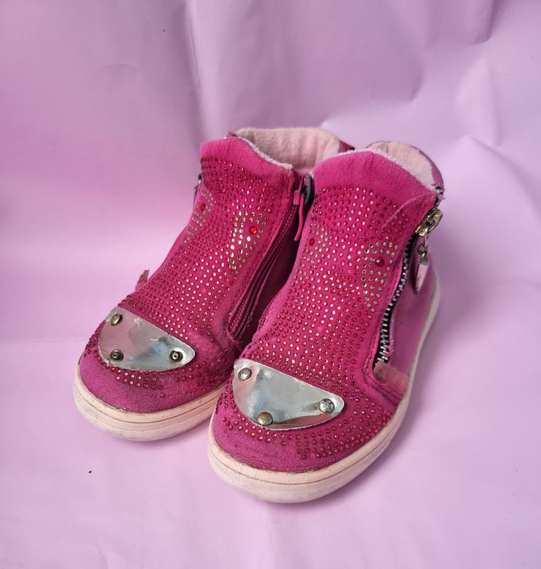 Зручні ботінки на дівчинку.замки всі працюють.стелька 16см.всередині м'який фліс спереду лиш трішки камінців відлетіло.