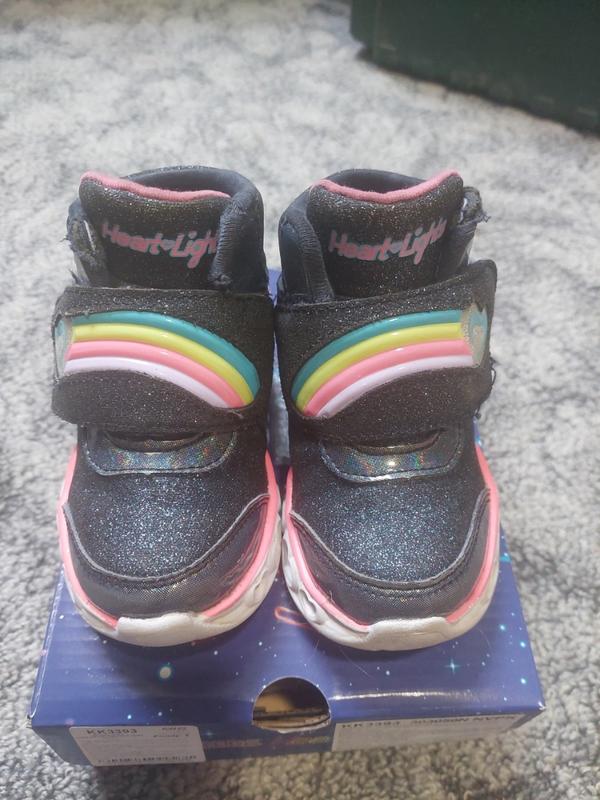 Черевики на ліпучці(можна регулювати повноту),дуже зручні.Вогники на підошві і на липучці мигають.Підійдуть на холоднішу осінь,початок весни.Не промокали нам,бо досить висока підошва