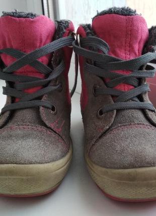 Нереально легкі, теплі і стильні черевички для дівчинки. За всю зиму жодного разу не промокли, і ніжка завжди була теплою. Довжина по устілці від краю до краю - 15,2 див. Верх - натуральна замша + текстиль, всередині - набивна овчина і повсть. Після двох діток (носили два сезони). Відповім на всі запитання та надам додаткові фото.