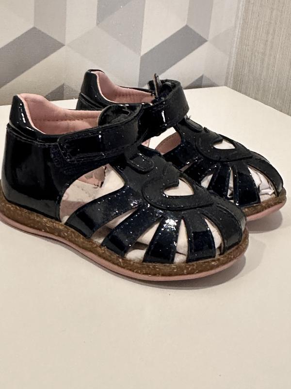Черевички для дівчинки, лакована шкіра, темно-синього кольору, з блискітками, ортопедична устілка, всередині шкіряні, розмір 22, підошва поліуретанова.