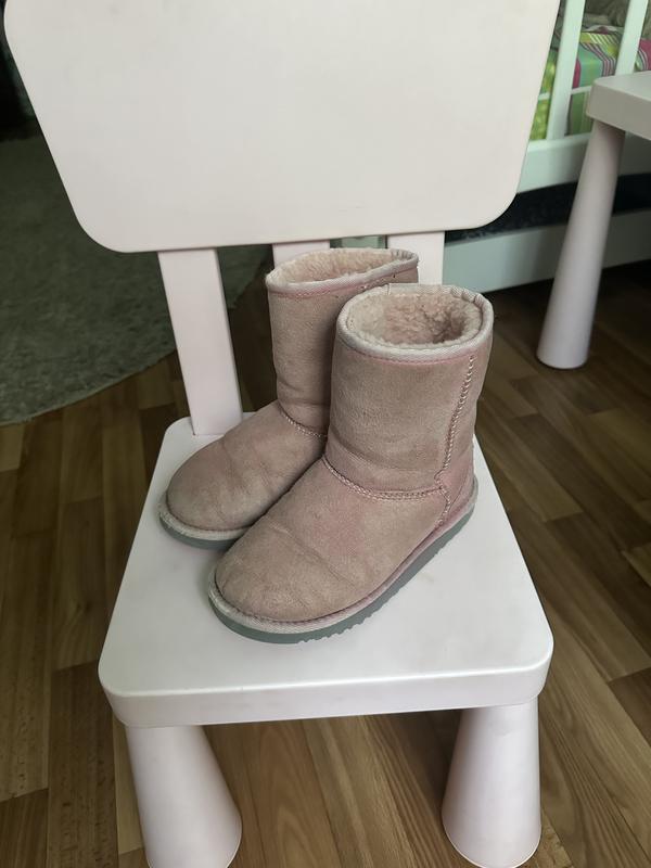 Дуже теплі уги на натуральному хутрі. Ідеальні для катання на горці. Трохи потерта тісьомка спереду, але на носіння це не впливає. Дефект врахований в ціну. Розмір 34. Замш світло-рожевий. Можно використати аерозоль з рожевим кольором.