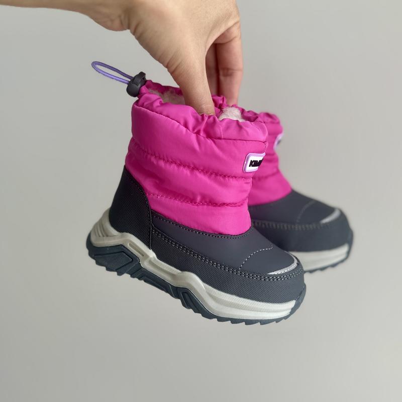 Дутики від TM Kimboo. Всередині штучне хутро. Зовні плащівка. Присутній боковий замок з захистом від потрапляння снігу. Верх холяви стягується затяжкою. Протекторна підошва. Розміри: 23-14,6 см 24-15,3 см ✖️ 25-16 см (2) бронь одна пара 26-16,5 см (2) 27-17,3 см 28-18 см