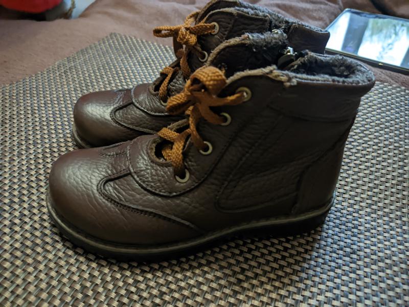 Черевики коричневі натуральна шкіра, укорочені,утеплені, міцні, не слизькі, зручні, гарно носяться. Підходять як дівчаткам так і хлопчикам. На замочку і на шнурівках. З дефектів затертий носик, в живу не так помітно як на фото. За детальною інформацією звертайтесь в приват.