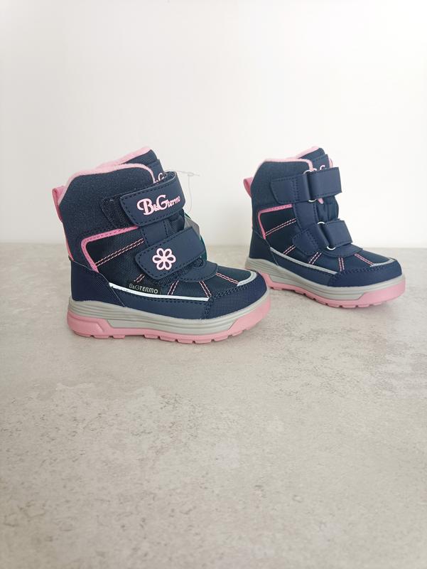 Размер: 22. Зимние НОВЫЕ термо ботинки для девочки. Верх выполнен из ткани, которая отталкивает воду (waterstop). Мембрана BG termo: водонепроницаемость, термоэффект, рекомендовано от +5 до -30° С. Подкладка - утеплитель из овечьей шерсти, байка, флис. Подошва из морозостойкого материала. Антискользящий рисунок протектора. 22 - стелька 14 см.