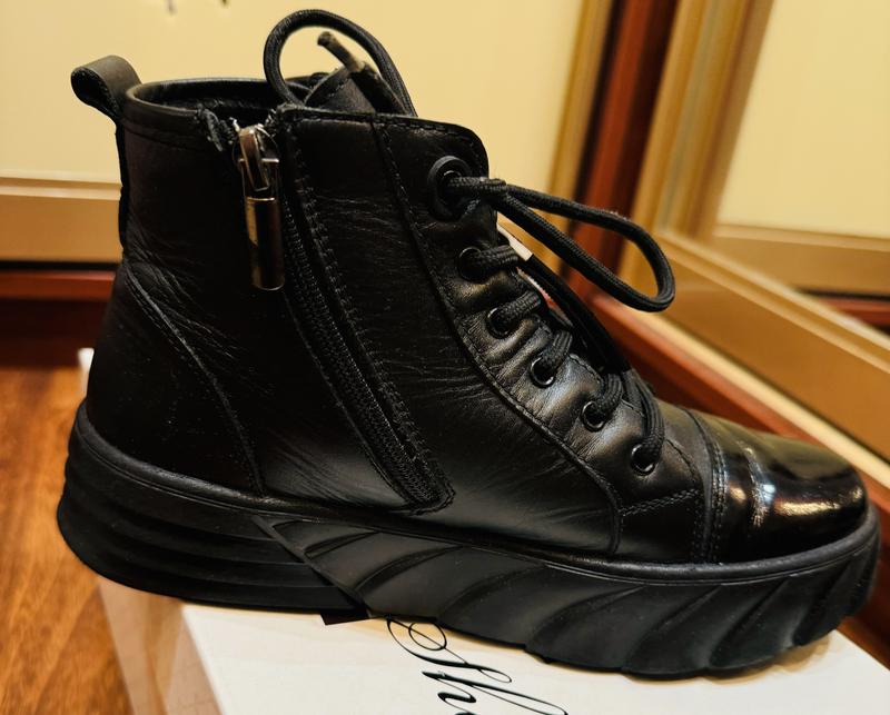 Зручні шкіряні демісезонні черевички для дівчинки. Дуже стильно виглядають, підошва підвищена, не промерзає, всередині тепла байка. Збоку замок-блискавка для зручного взування, шнурки теж функціональні, на шнурках силіконова прикраса. Носки виконані з лакованої шкіри, мають незначні подряпині, показала на фото. Взуття в чудовому стані, бо придбане в кінці сезону, дитина поносила 2 тижні, а потім переросла.