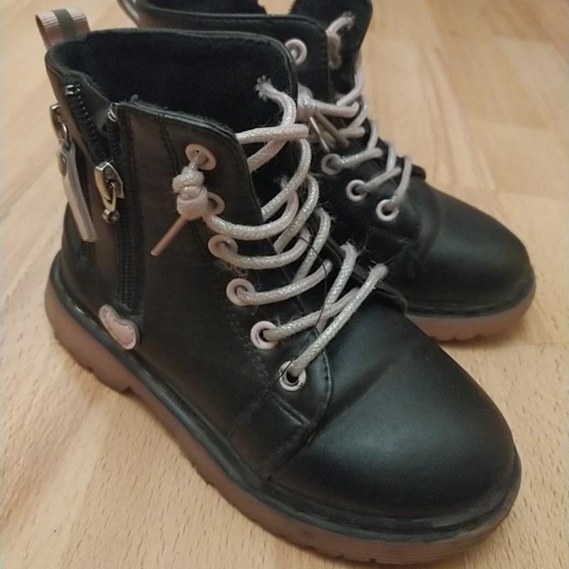Стильные ботинки, размер 30. Есть незначительные потертости спереди, в глаза не бросаются. Верх целый. Окрашен черной краской для обуви вообще не будет видно. Состояние очень хорошее. Красиво смотрятся на ножке. Длина подошвы 20,5 см. Подстилка не вынимается. Ориентировочно 19 см.