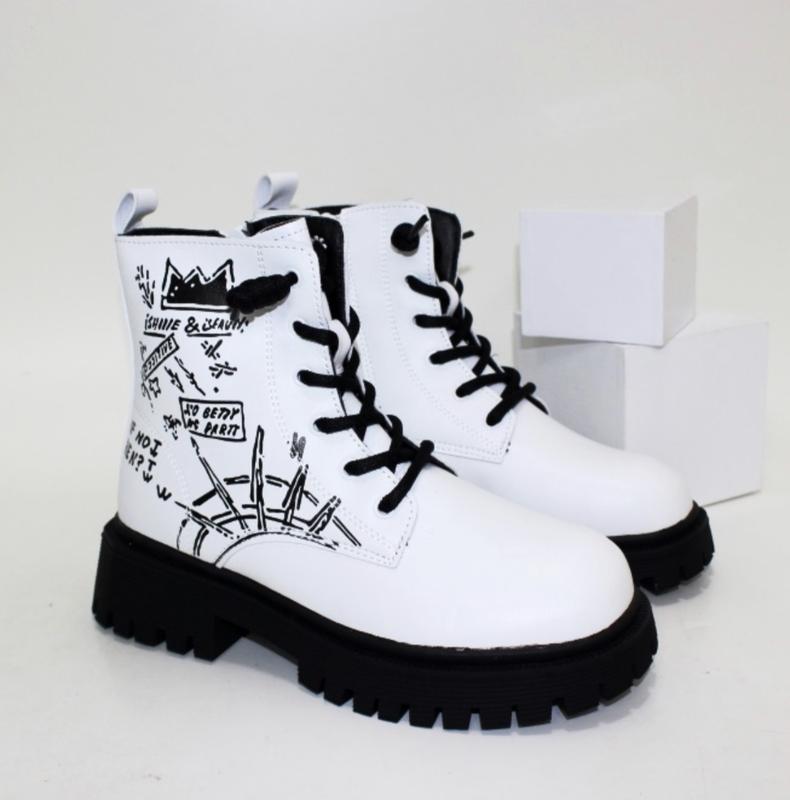Білі з чорними написами зимові підліткові черевики Код: 114408 (C40399-7-1) Бренд: Foletti Матеріал верху штучна шкіра Матеріал устілки штучне хутро Кольори в наявності білий Сезонність зима, осінь-зима Країна виробник Китай Заміри по устілці 32-21.0см 33-21.5см 34-22.3см 35-23.0см 36-23.5см 37-24.0см
