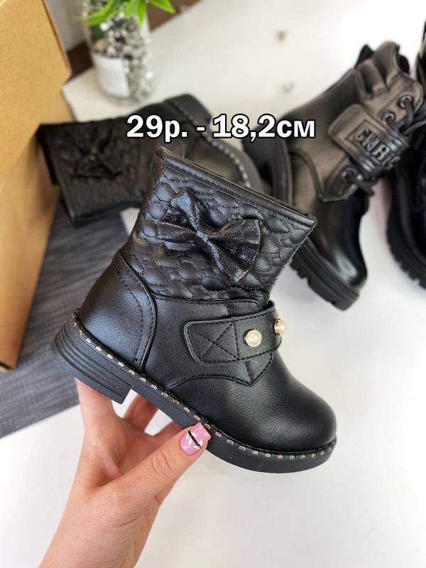 Стильные черные ботинки с бутиками. Спереди липучка. Сбоку на молнии. Материал подкладки - флис. Стелька флис. Распродажа на последний размер. 29р. - 18,2см Измерение сделано внутри по стельке лично мной, погрешность 1-2мм допустима.